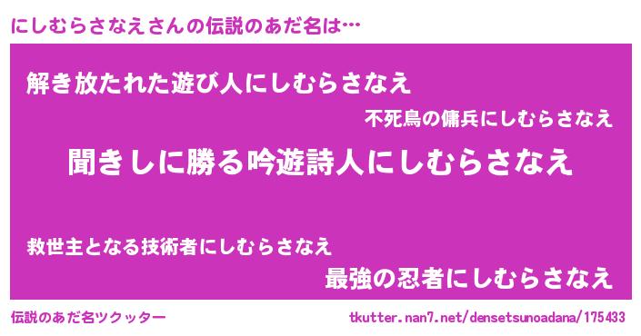 | 意味不明あだ名 | 『永久保存にしむらさなえ』 |