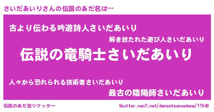 | 胡散臭い通販商品みたいなあだ名 | 『必ず成功するブレスレット…その名も「さいだあいり」』 |