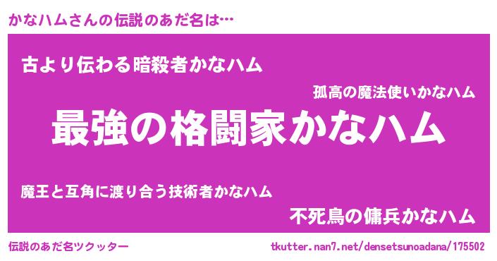 | 意味不明あだ名 | 『ニラ科かなハム属』『自称かなハム』 |