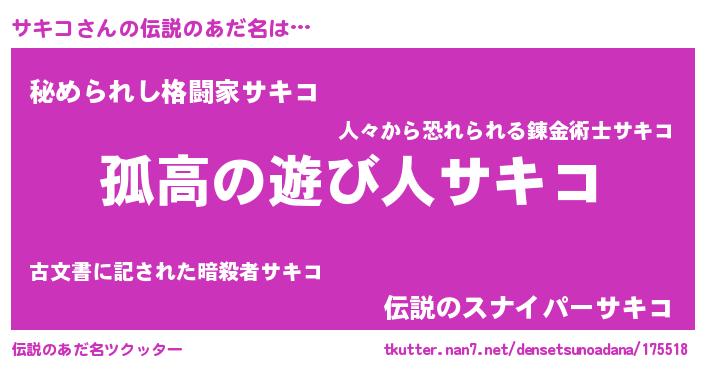 | ヒーロー風カッコイイあだ名 | 『黄金騎士サキ』『超時空戦士サキコ』 |