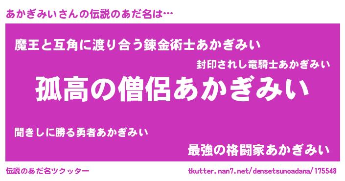 | 男性向けラノベタイトル風あだ名 | 『ダンジョンにあかぎみいを求めるのは間違っているだろうか』 |