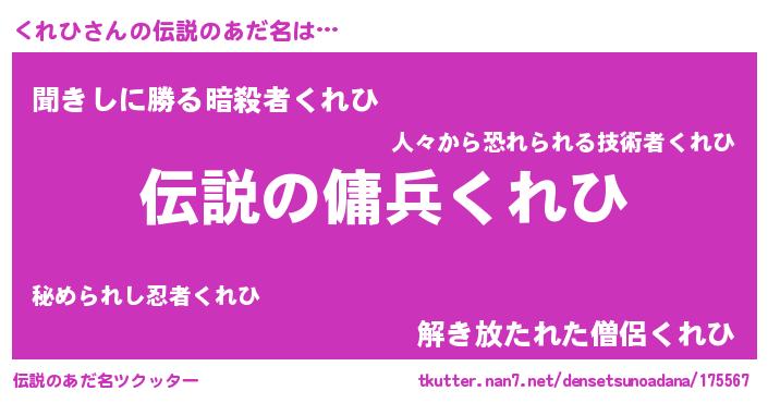 | 男性向けラノベタイトル風あだ名 | 『くれひの憂鬱』『魔弾の王とくれひ』 |