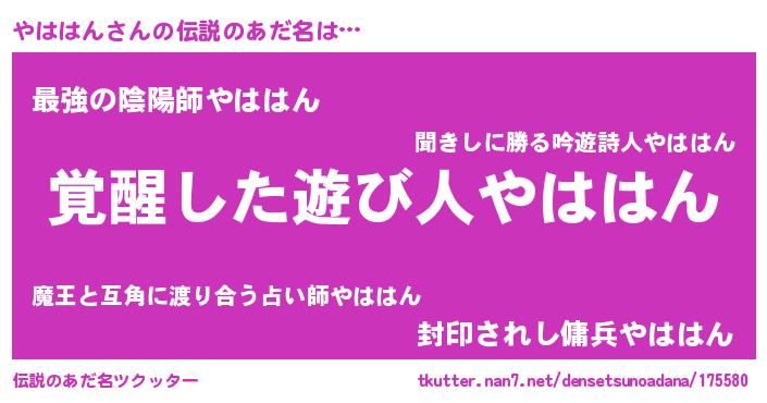 | ヒーロー風カッコイイあだ名 | 『炎刃騎士ヤハ』『ウルトラやははんマン』 |