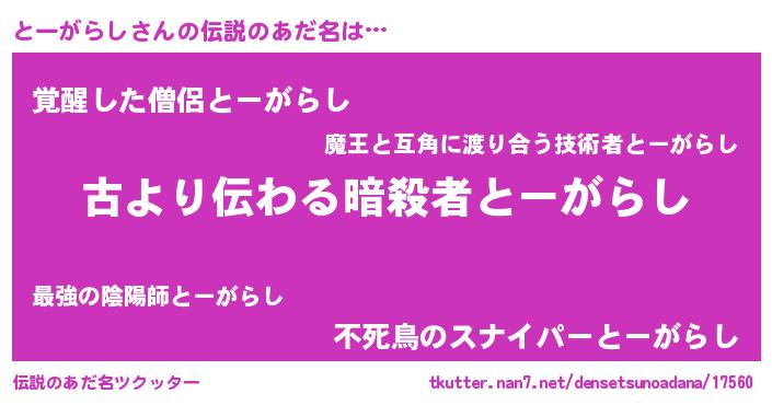 | ヒーロー風カッコイイあだ名 | 『ネオトーガラシ』『幻影騎士トー』 |