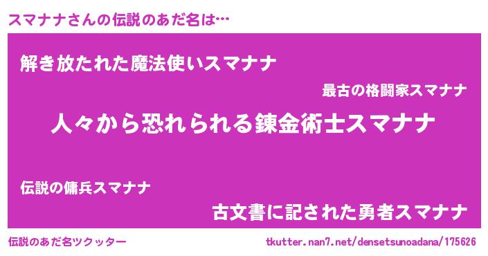 | 男性向けラノベタイトル風あだ名 | 『おまえをオタクにしてやるから、俺をスマナナにしてくれ! 』 |
