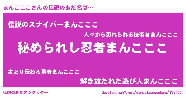 | 女子向けラノベタイトル風あだ名 | 『まんこここが死なない童話 林檎のまんこここの診療簿』 |
