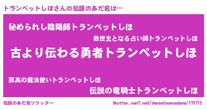 | 胡散臭い通販商品みたいなあだ名 | 『来世でも幸せになれる水素水…その名も「トランペットしほ」』 |
