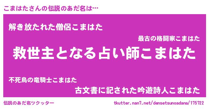 | ヒーロー風カッコイイあだ名 | 『慈愛の使者こまはた』『幻影騎士コマ』 |
