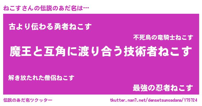 | 男性向けラノベタイトル風あだ名 | 『おまえをオタクにしてやるから、俺をねこすにしてくれ! 』 |