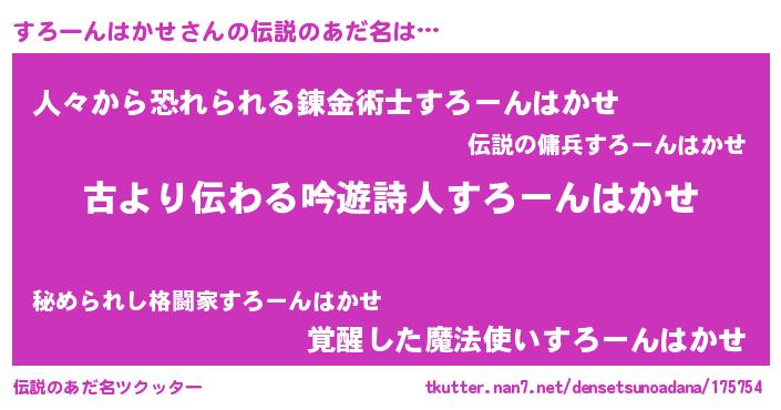 | 男性向けラノベタイトル風あだ名 | 『すろーんはかせに滅ぼされるだけの簡単なお仕事です』 |