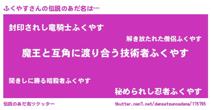 | 意味不明あだ名 | 『自称ふくやす』『ペロリンふくやす』 |