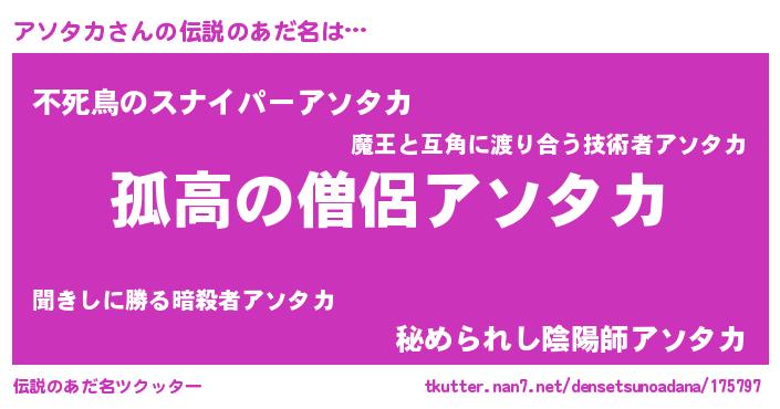 | 男性向けラノベタイトル風あだ名 | 『アソタカスレイヤー』 |