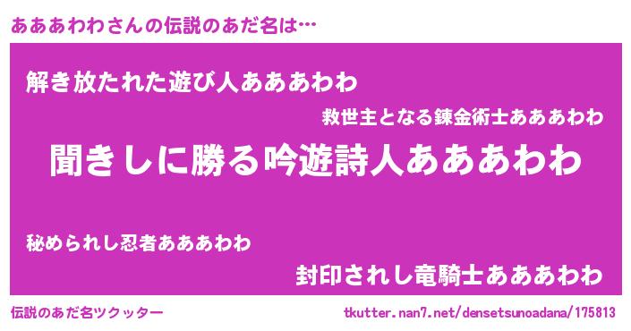 | ヒーロー風カッコイイあだ名 | 『ネオアアアワワ』『魔戒騎士アア』 |