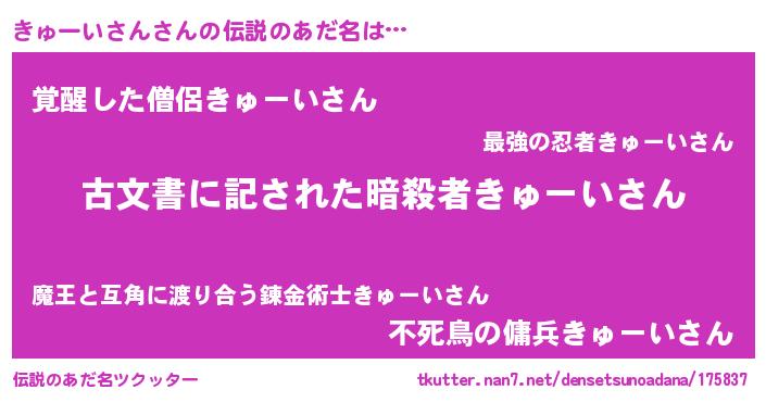 | ヒーロー風カッコイイあだ名 | 『仮面キュダー』『最強戦士キューイサン』 |