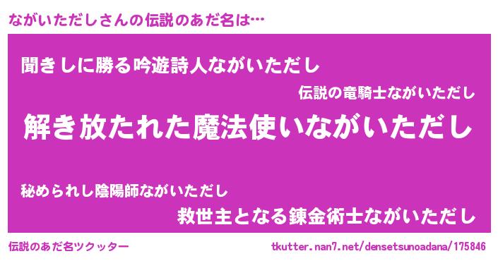 | 男性向けラノベタイトル風あだ名 | 『ながいただしの嫁は女の子じゃないと思った?』 |