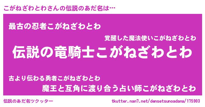 | 胡散臭い通販商品みたいなあだ名 | 『必ず成功するブレスレット…その名も「こがねざわとわ」』 |