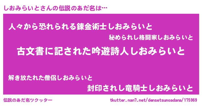 | ヘコむあだ名 | 『しおみらいと(小並感)』『しおにー』 |