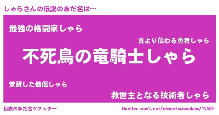 | 男性向けラノベタイトル風あだ名 | 『しゃらに滅ぼされるだけの簡単なお仕事です』 |