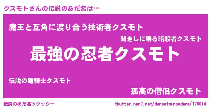 | 男性向けラノベタイトル風あだ名 | 『クスモトに滅ぼされるだけの簡単なお仕事です』 |