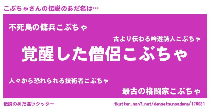 | 男性向けラノベタイトル風あだ名 | 『こぶちゃの嫁は女の子じゃないと思った?』 |