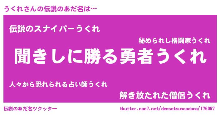 | 男性向けラノベタイトル風あだ名 | 『うくれという概念が存在しない退屈な世界 』 |