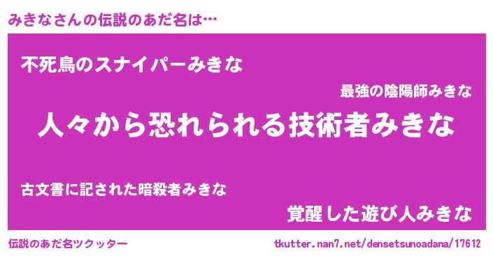 | 男性向けラノベタイトル風あだ名 | 『はたらくみきなさま!』『みきなの憂鬱』 |