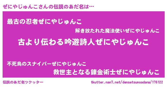 | 男性向けラノベタイトル風あだ名 | 『転生したらぜにやじゅんこだった件』 |
