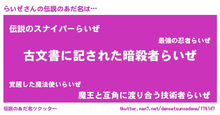 | 意味不明あだ名 | 『自称らいぜ』『永久保存らいぜ』 |
