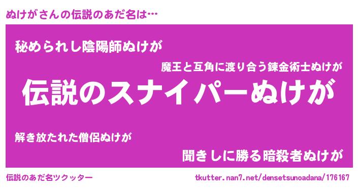 | 男性向けラノベタイトル風あだ名 | 『はたらくぬけがさま!』『ぬけがの憂鬱』 |