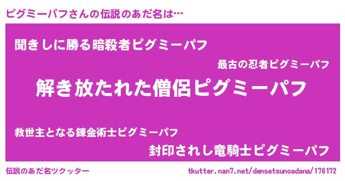 | 男性向けラノベタイトル風あだ名 | 『ダンジョンにピグミーパフを求めるのは間違っているだろうか』 |