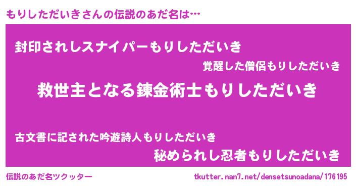 | ヒーロー風カッコイイあだ名 | 『慈愛の使者もりしただいき』 |