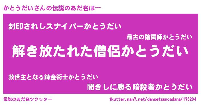 | ヒーロー風カッコイイあだ名 | 『魔戒騎士カト』『最強戦士カトウダイ』 |