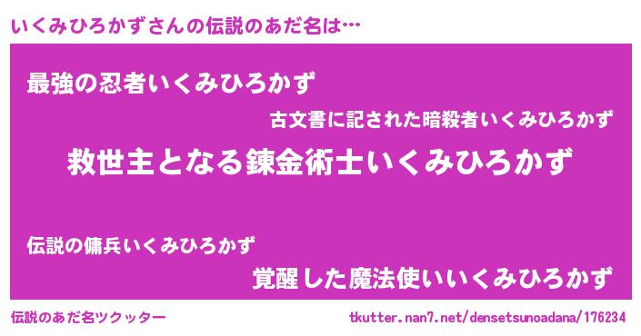 | 男性向けラノベタイトル風あだ名 | 『いくみひろかず~年齢イコール彼女いない歴の魔法使い~』 |