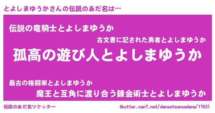 | 男性向けラノベタイトル風あだ名 | 『ダンジョンにとよしまゆうかを求めるのは間違っているだろうか』 |