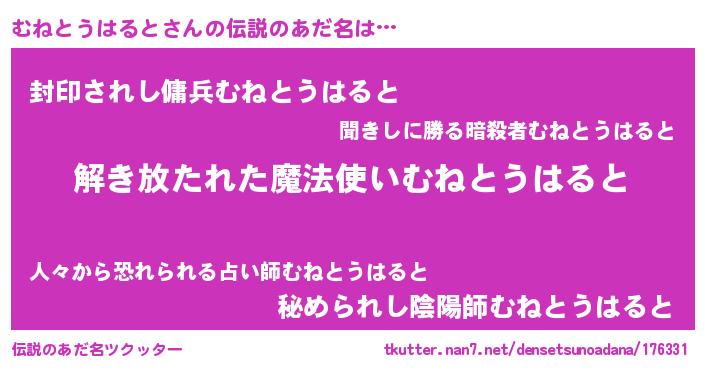 | 意味不明あだ名 | 『とにかく怪しいむねとうはると』 |