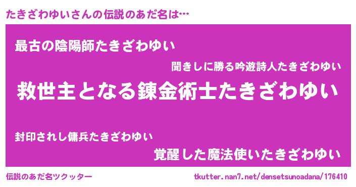 | 男性向けラノベタイトル風あだ名 | 『たきざわゆい~年齢イコール彼女いない歴の魔法使い~』 |