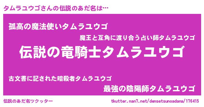 | ヒーロー風カッコイイあだ名 | 『スーパータムラユウゴ』『炎刃騎士タム』 |