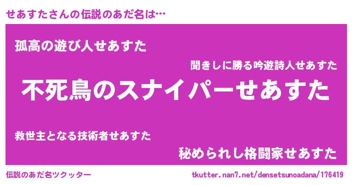 | 意味不明あだ名 | 『住所不定無職せあすた(89歳)』 |