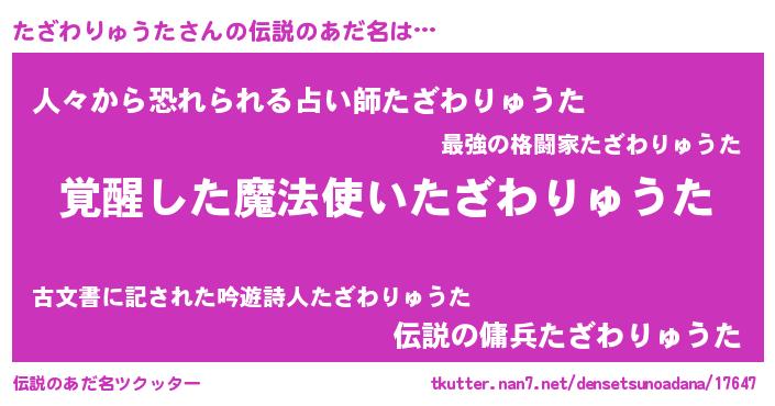 | 男性向けラノベタイトル風あだ名 | 『たざわりゅうたの嫁は女の子じゃないと思った?』 |