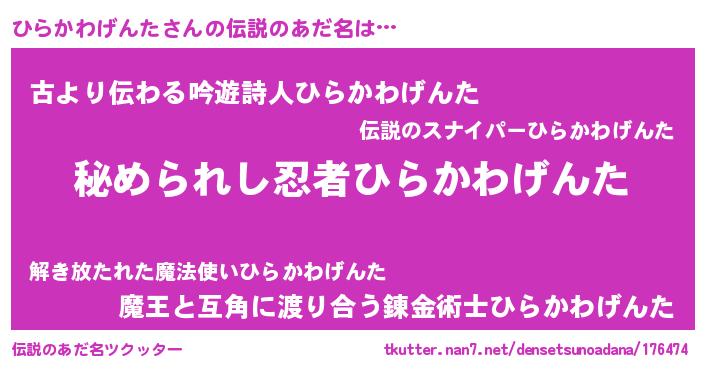 | 女子向けラノベタイトル風あだ名 | 『ひらかわげんたなんてお断りですっ。』 |
