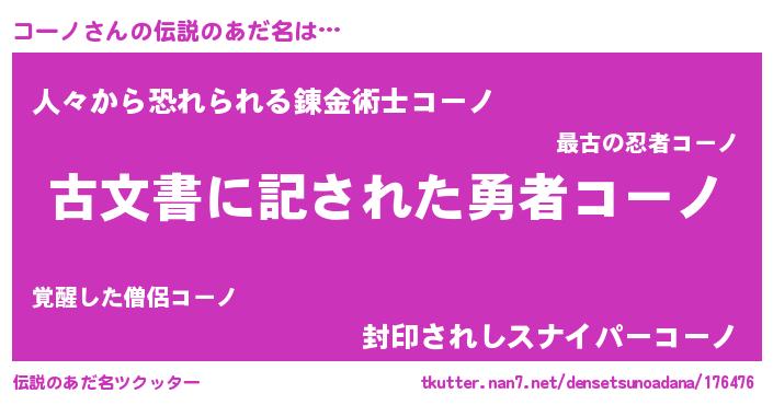 | 胡散臭い通販商品みたいなあだ名 | 『あなたにだけ特別に提供する世界で10本だけ現存している希少なブランデー…その名も「コーノ」』 |