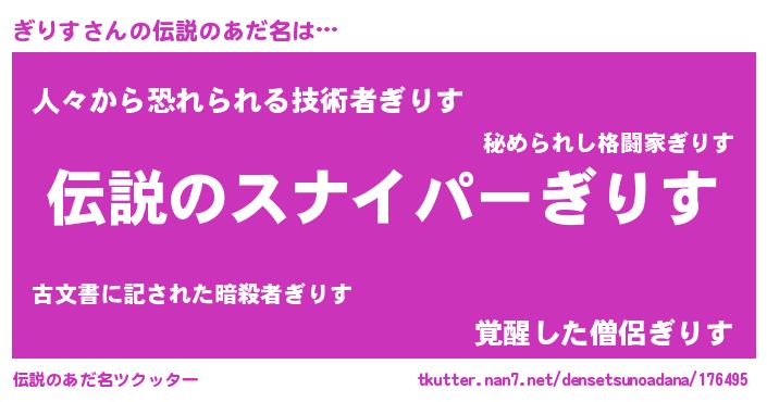 | 男性向けラノベタイトル風あだ名 | 『魔弾の王とぎりす』『ぎりすの憂鬱』 |