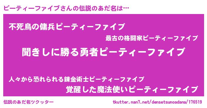 | 男性向けラノベタイトル風あだ名 | 『ピーティーファイブという概念が存在しない退屈な世界 』 |