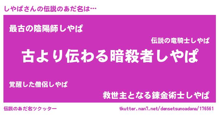 | 男性向けラノベタイトル風あだ名 | 『しやぱという概念が存在しない退屈な世界 』 |