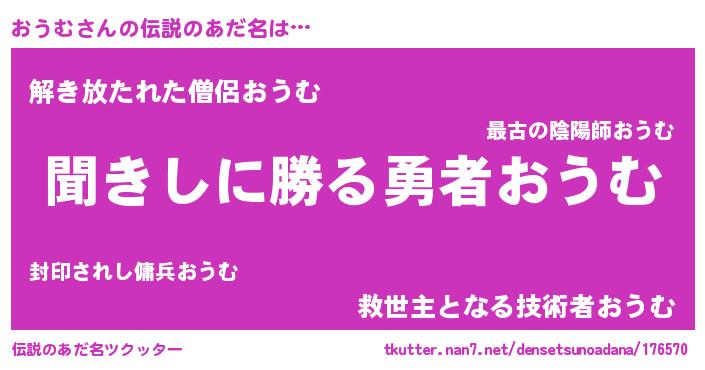 | 胡散臭い通販商品みたいなあだ名 | 『絶対に幸福をもたらす水素水…その名も「おうむ」』 |
