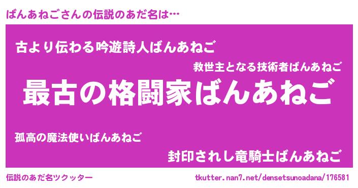 | 意味不明あだ名 | 『住所不定無職ばんあねご(12歳)』 |