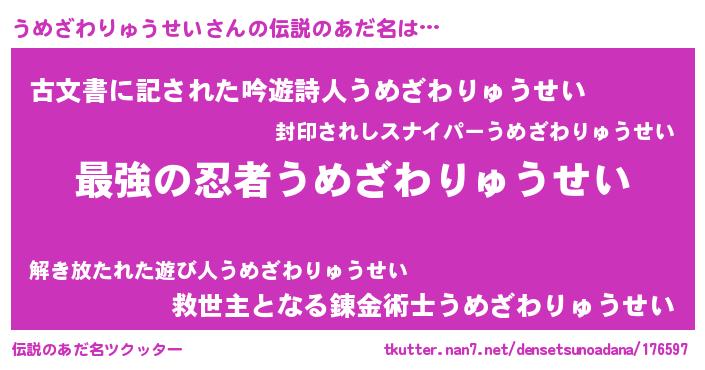 | 男性向けラノベタイトル風あだ名 | 『うちのうめざわりゅうせいが世界を掌握している!』 |