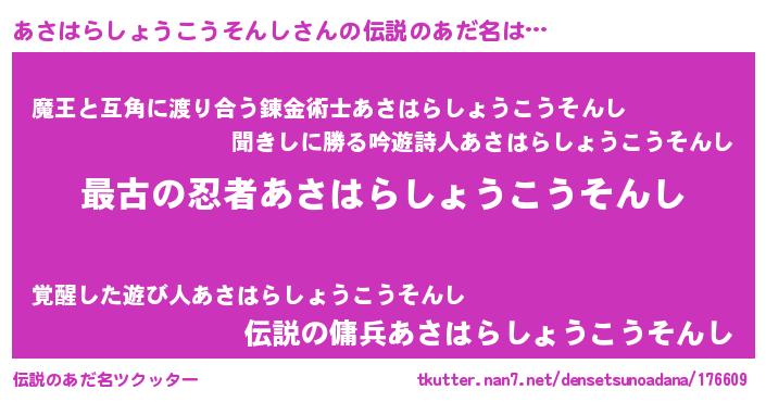 男性向けラノベタイトル風あだ名 | 『転生したらあさはらしょうこうそんしだった件』 |