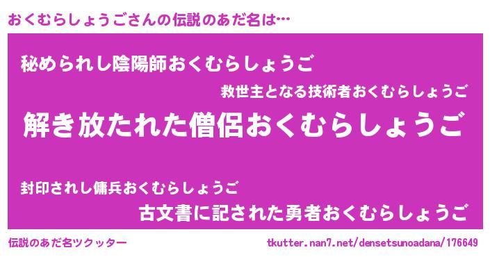 | 意味不明あだ名 | 『とにかく怪しいおくむらしょうご』 |