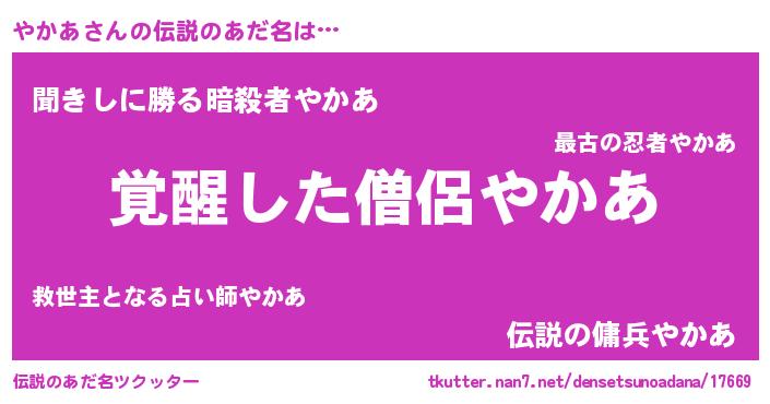 | 男性向けラノベタイトル風あだ名 | 『やかあに滅ぼされるだけの簡単なお仕事です』 |